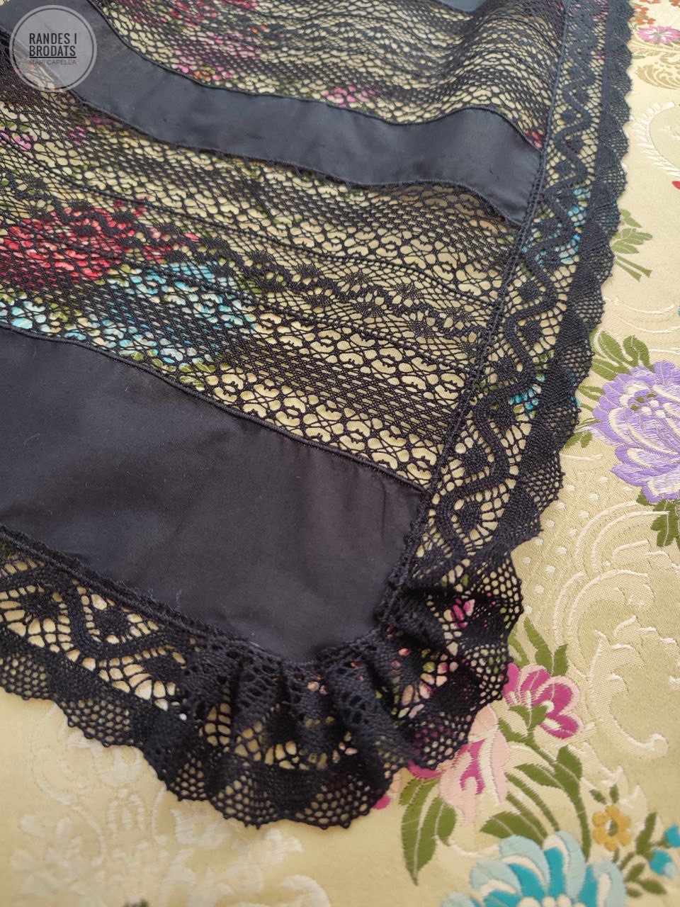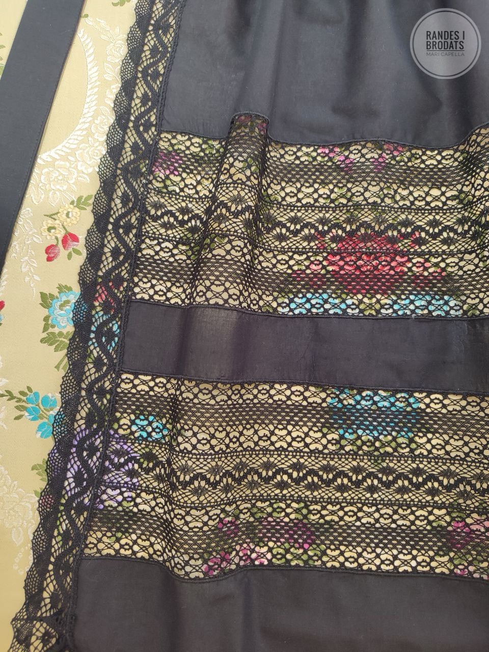Delantal de batista negro con puntilla y entredoses de bolillo