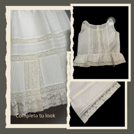 Con puntillas y entredoses de Alençon, Bolillo extrafino y tira de Plumeti, pequeñas lorzas de decoración y una lorza más grande en la parte de la cadera para poder alargar el tamaño de la enagua posteriormente.