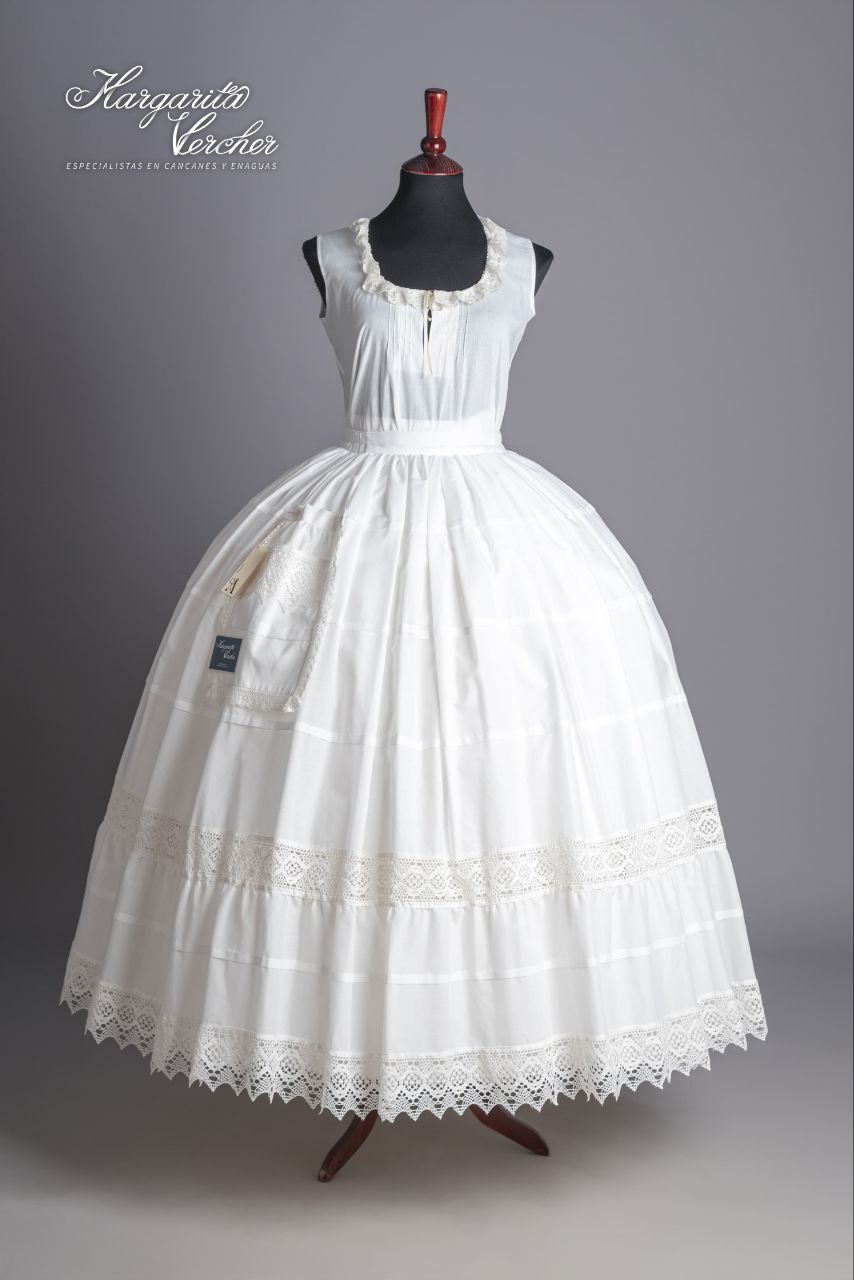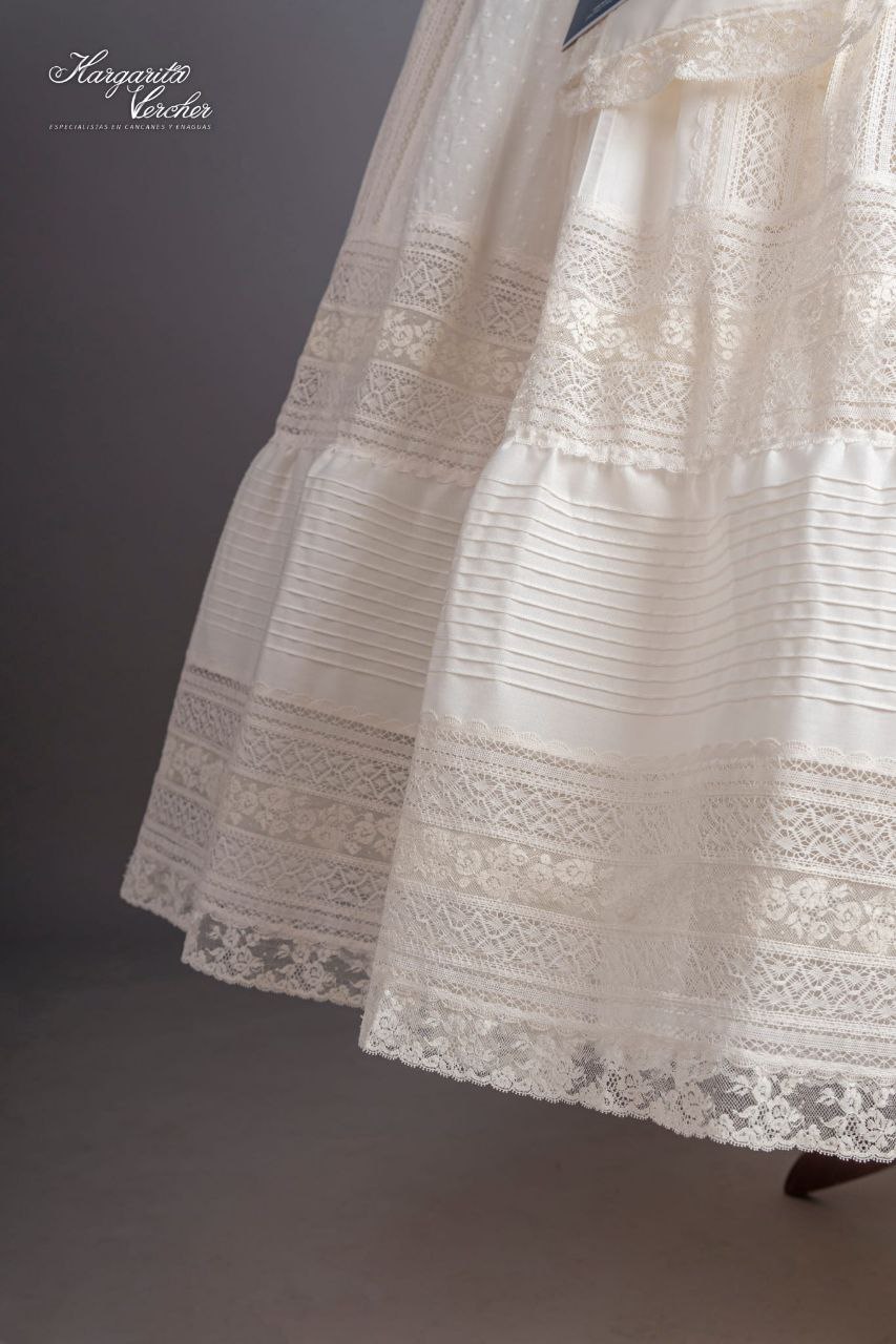 Con puntilla y entredoses de Bolillo, lorzas de decorativas y un par de lorzas más grandes en la parte de la cadera para poder alargar el tamaño de la enagua posteriormente.