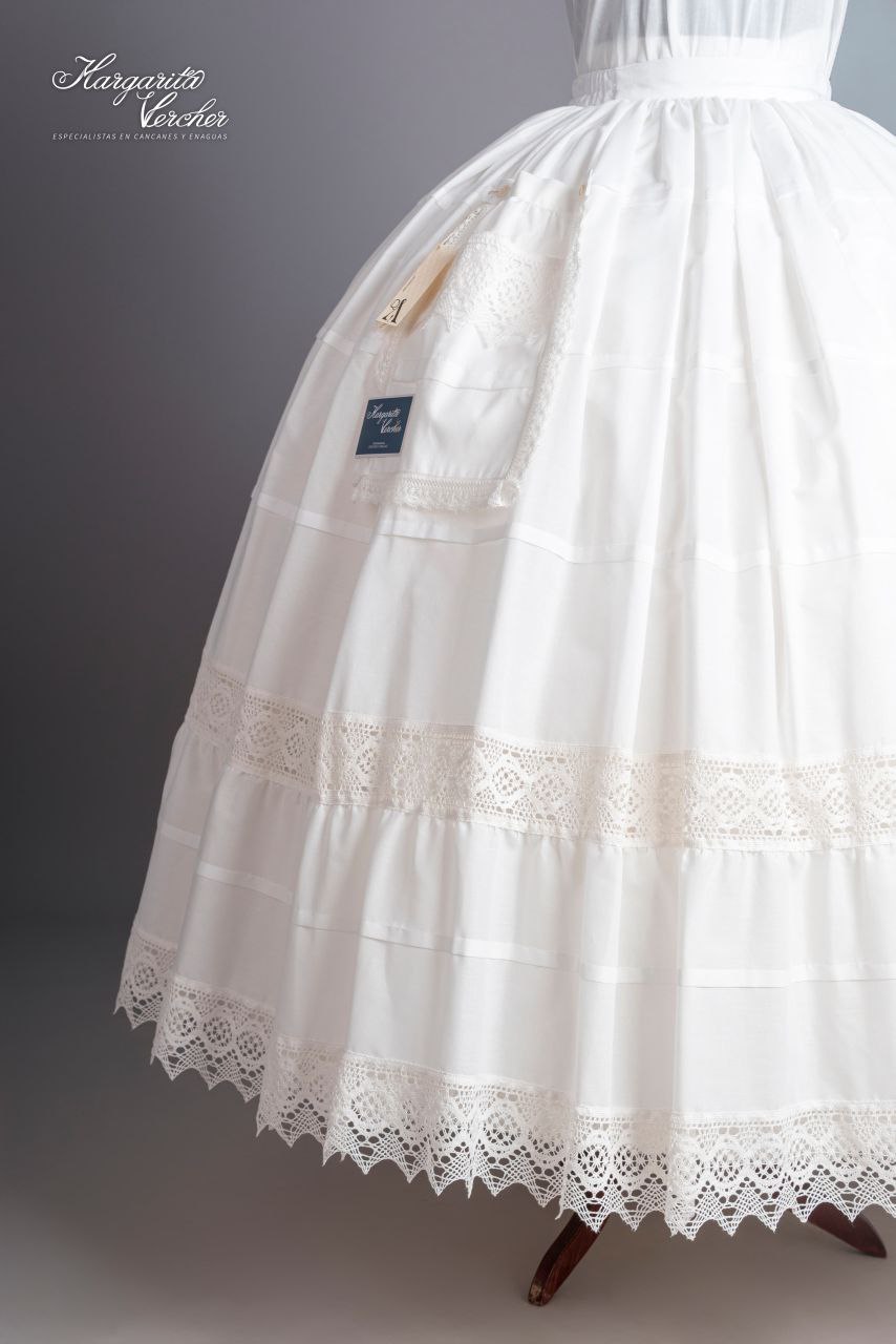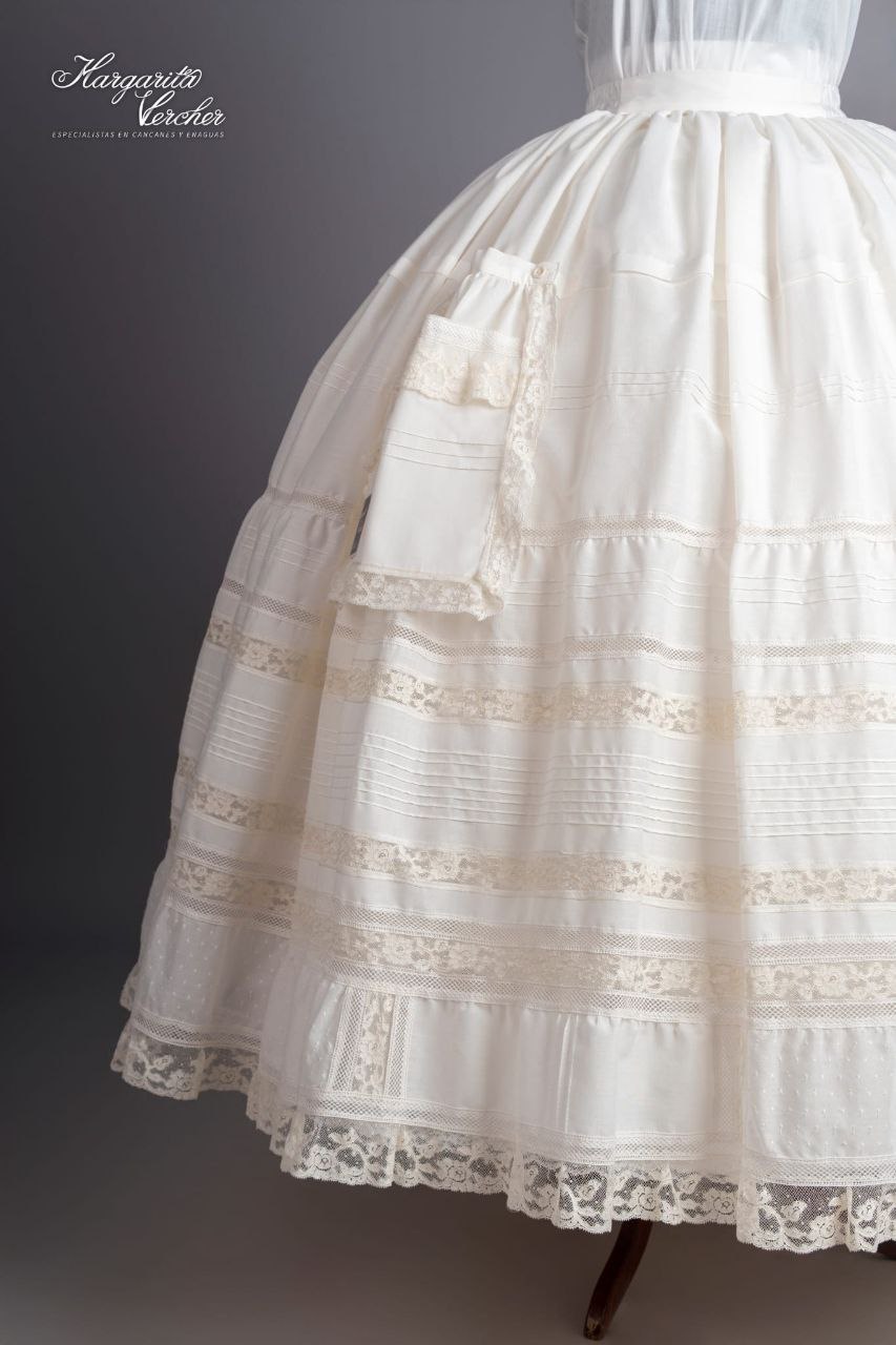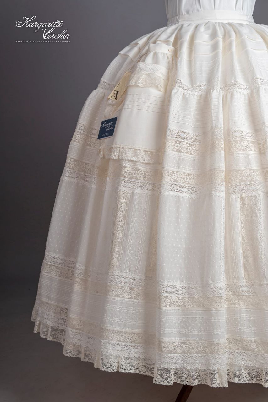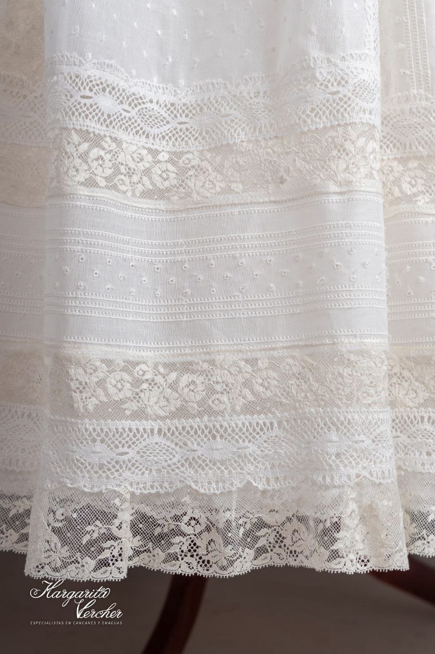 Con puntillas y entredoses de Valencien, Bolillo extrafino y tira de Plumeti, pequeñas lorzas de decoración y una lorza más grande en la parte de la cadera para poder alargar el tamaño de la enagua posteriormente.