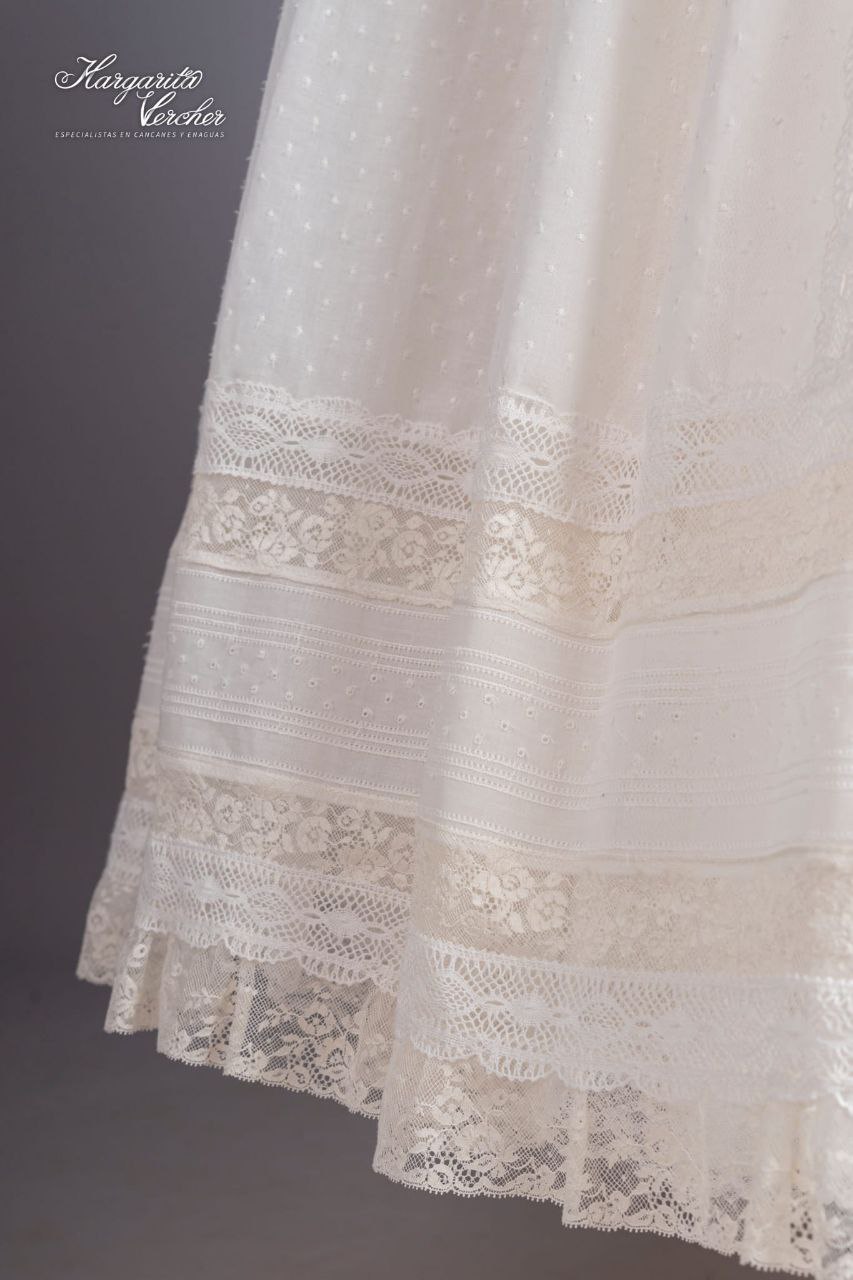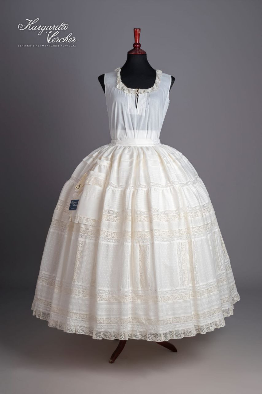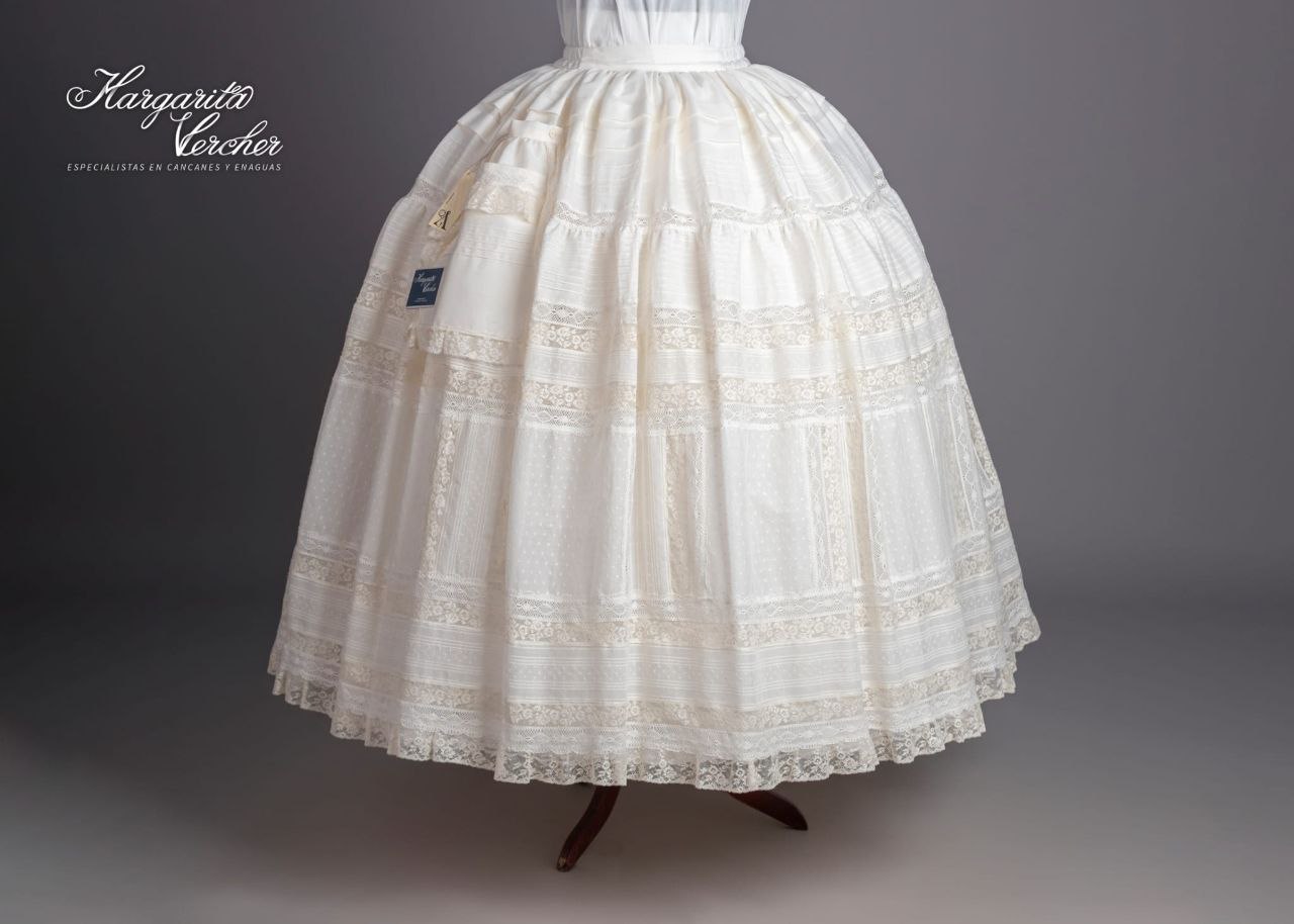 Con puntillas y entredoses de Valencien, Bolillo extrafino y tira de Plumeti, pequeñas lorzas de decoración y una lorza más grande en la parte de la cadera para poder alargar el tamaño de la enagua posteriormente.
