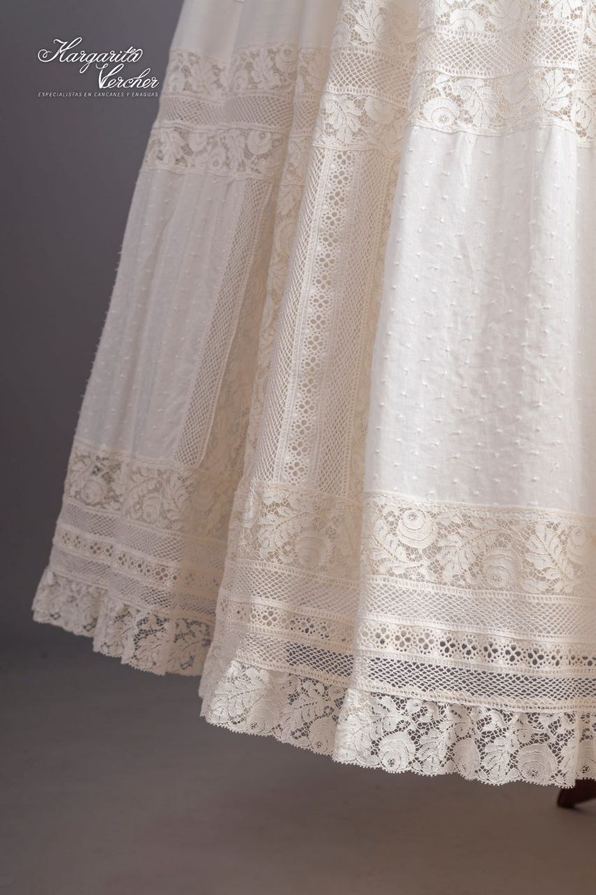 Con puntillas y entredoses de Alençon Divina, Bolillo extrafino y tira bordada, pequeñas lorzas de decoración y una lorza más grande en la parte de la cadera para poder alargar el tamaño de la enagua posteriormente.