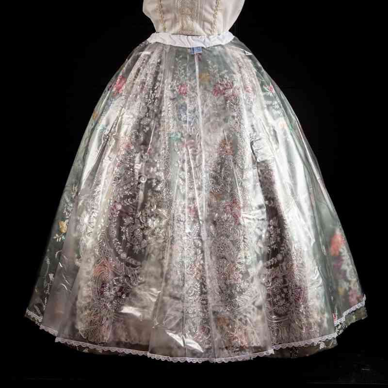 Con puntilla, entredoses y pasacintas de Bolillo, pequeñas lorzas de decoración y una lorza más grande en la parte de la cadera para poder alargar el tamaño de la enagua posteriormente.