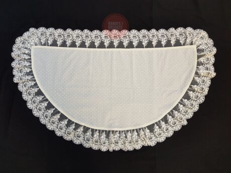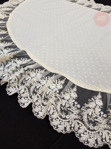 Con puntilla de tul bordado al tono, y detalle de bolillito a mano incrustado en la unión de la batista y el tul.