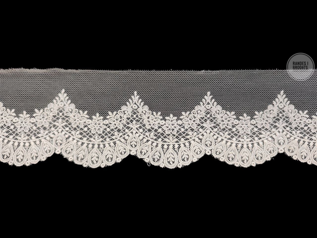 Tul de fibra en tono blanco roto y beige oscuro, bordado en hilo de algodón al tono, con un dibujo elegante y delicado.